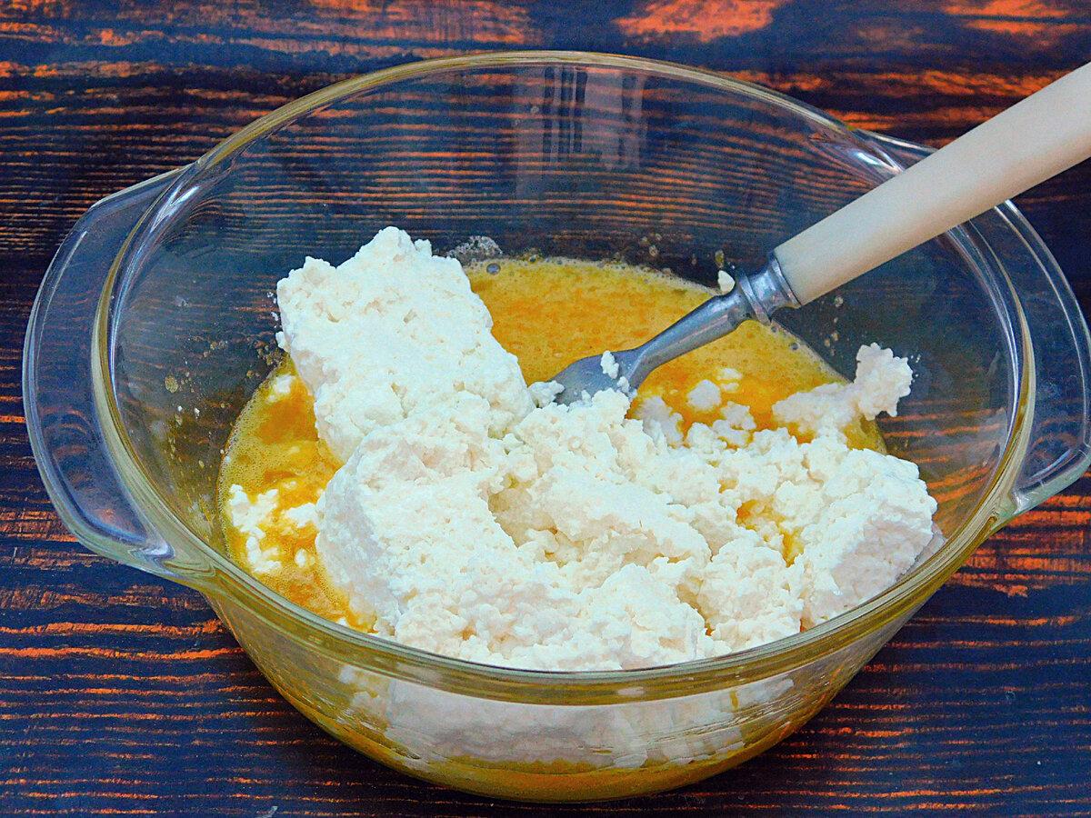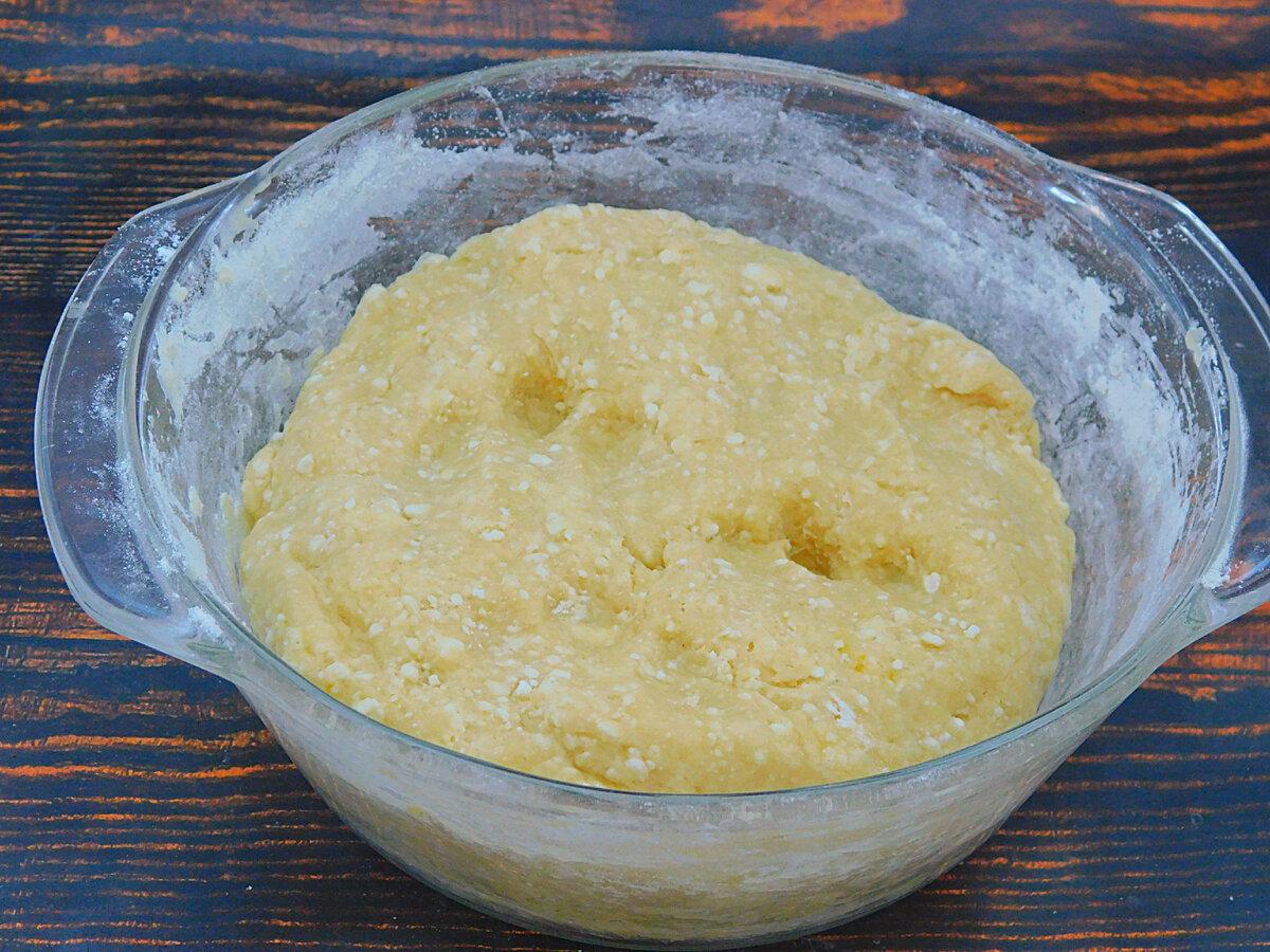 Розтерти виделкою, розбиваючи великі сирні грудочки. Потім вже вводити і решту борошна. Але його може знадобитися більше або менше, це залежить від вологості сиру. У підсумку повинно вийти м’яке, але не липке тісто. Зайве борошно не підсипати, чим менше, тим краще, головне, щоб тісто можна було без проблем розкачати.