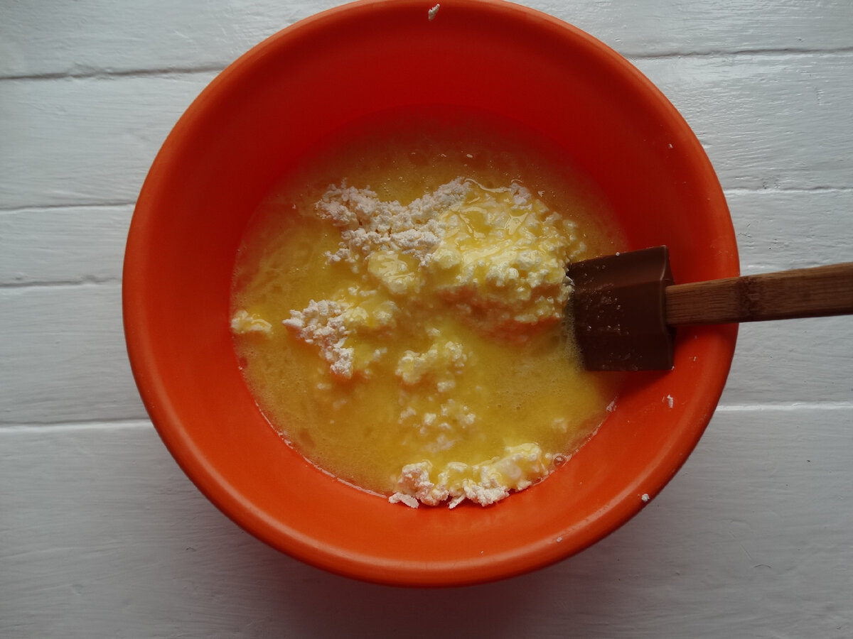 Просіюємо борошно і додаємо його в сирну основу. Замішуємо тісто.