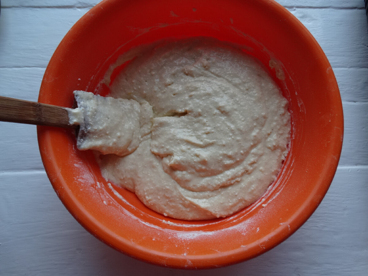 Я додала 1,5 склянки борошна. Мені тісто на цей момент здалося досить густим. Від лопатки залишається чіткий слід, і довго тісто не з’єднується. Ось це і є показник правильної консистенції тіста.