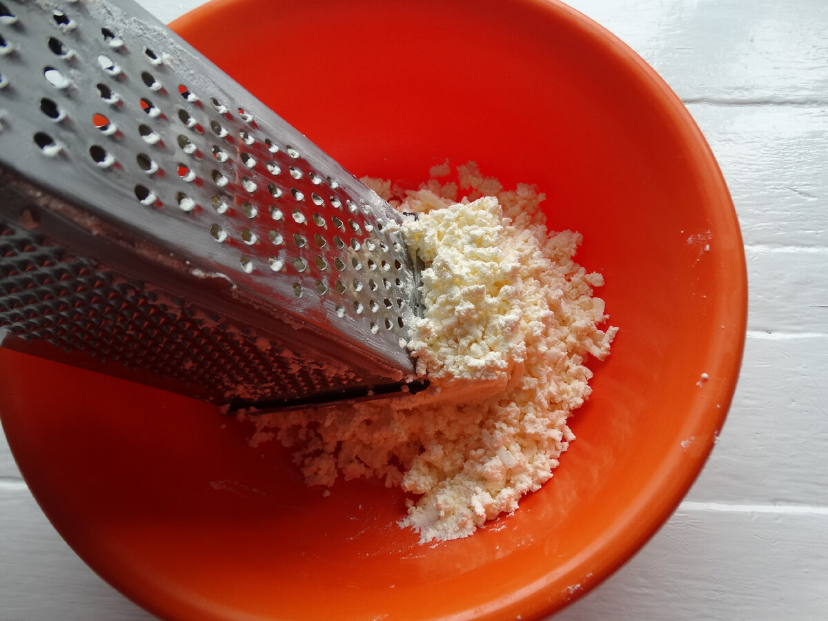 Сир тремо на терці. Можна через сито пропустити, але не варто подрібнювати його в блендері. Тоді маса буде більш рідка, ніж нам треба.
