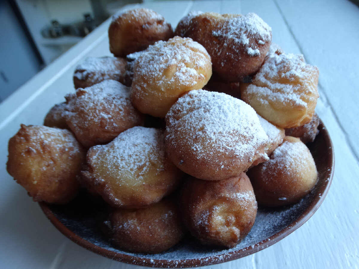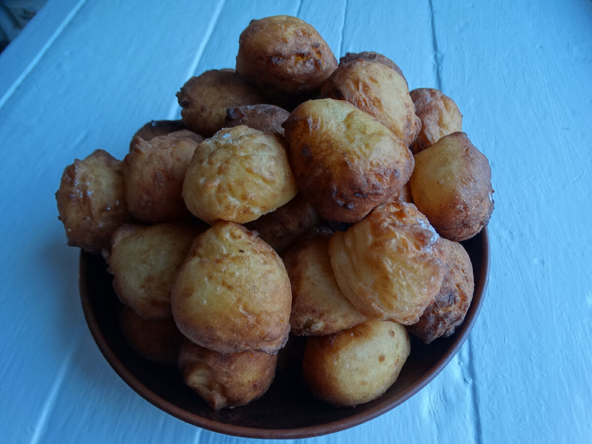 Пончики готові. Вони в олії ще підросли. Поки гарячі, зверху у них хрустка скоринка. Але потім вона стає м’якесенькою, як всередині, також і зовні.