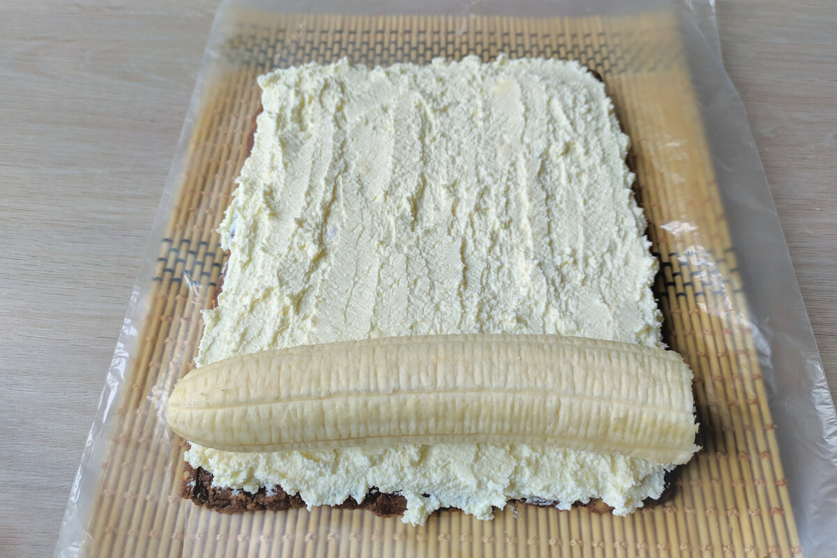 6. Зверху по всій поверхні розмазуємо сир і кладемо в нижнім краю банан. Банан обрізаємо за розміром при необхідності.
