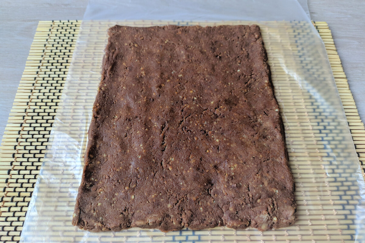 5. На пакет або харчову плівку викладаємо шоколадну масу і рівномірно її розділимо в формі плоского прямокутника.
