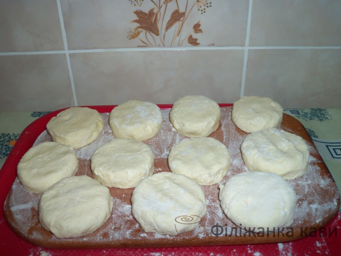 Дошку обсипаємо борошном, щоб продукти не прилипали, і складаємо напівфабрикати на поверхню.