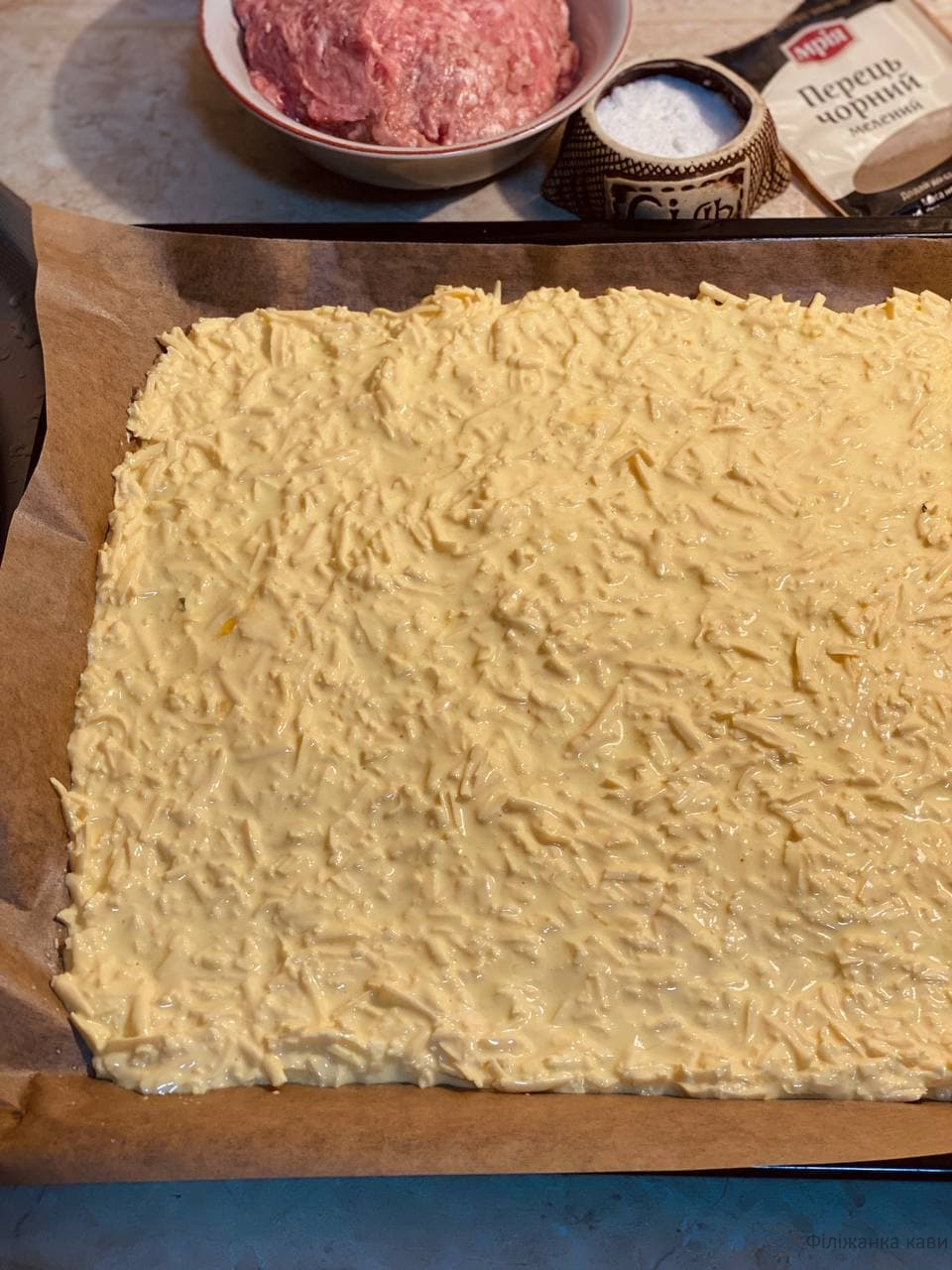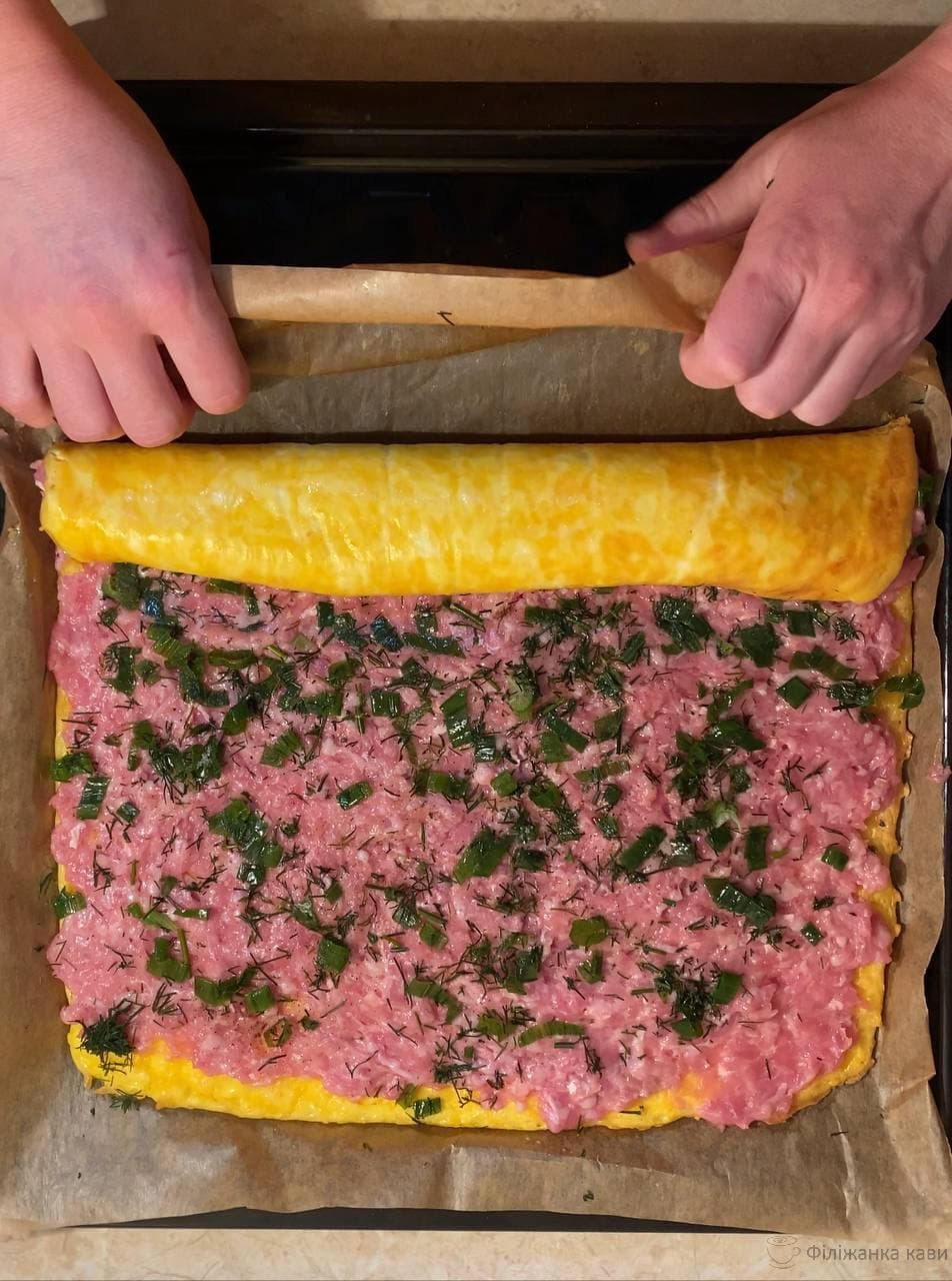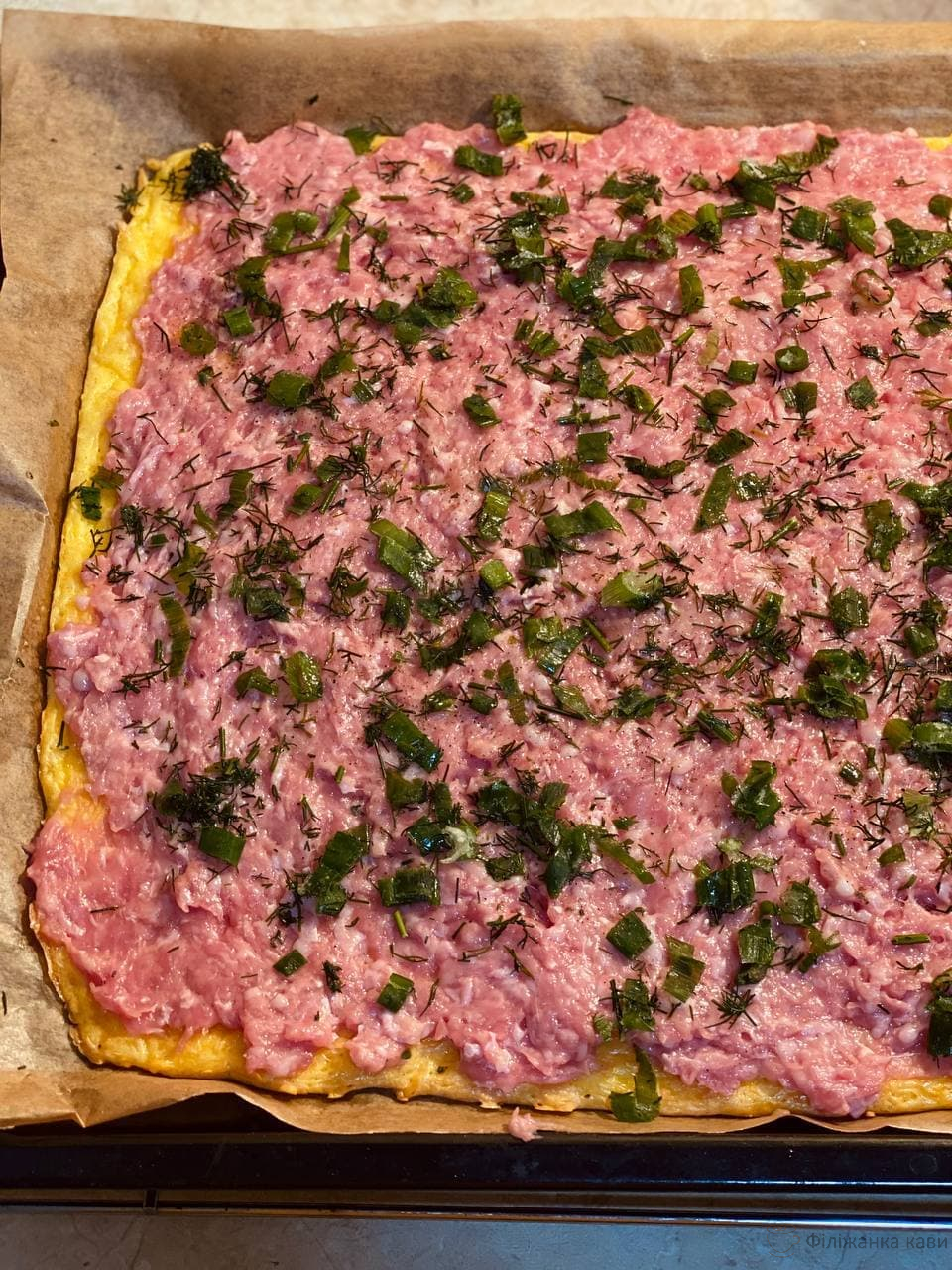 На спечений корж викладаємо фарш, посипаємо зеленню (у мене окріп і цибулька)