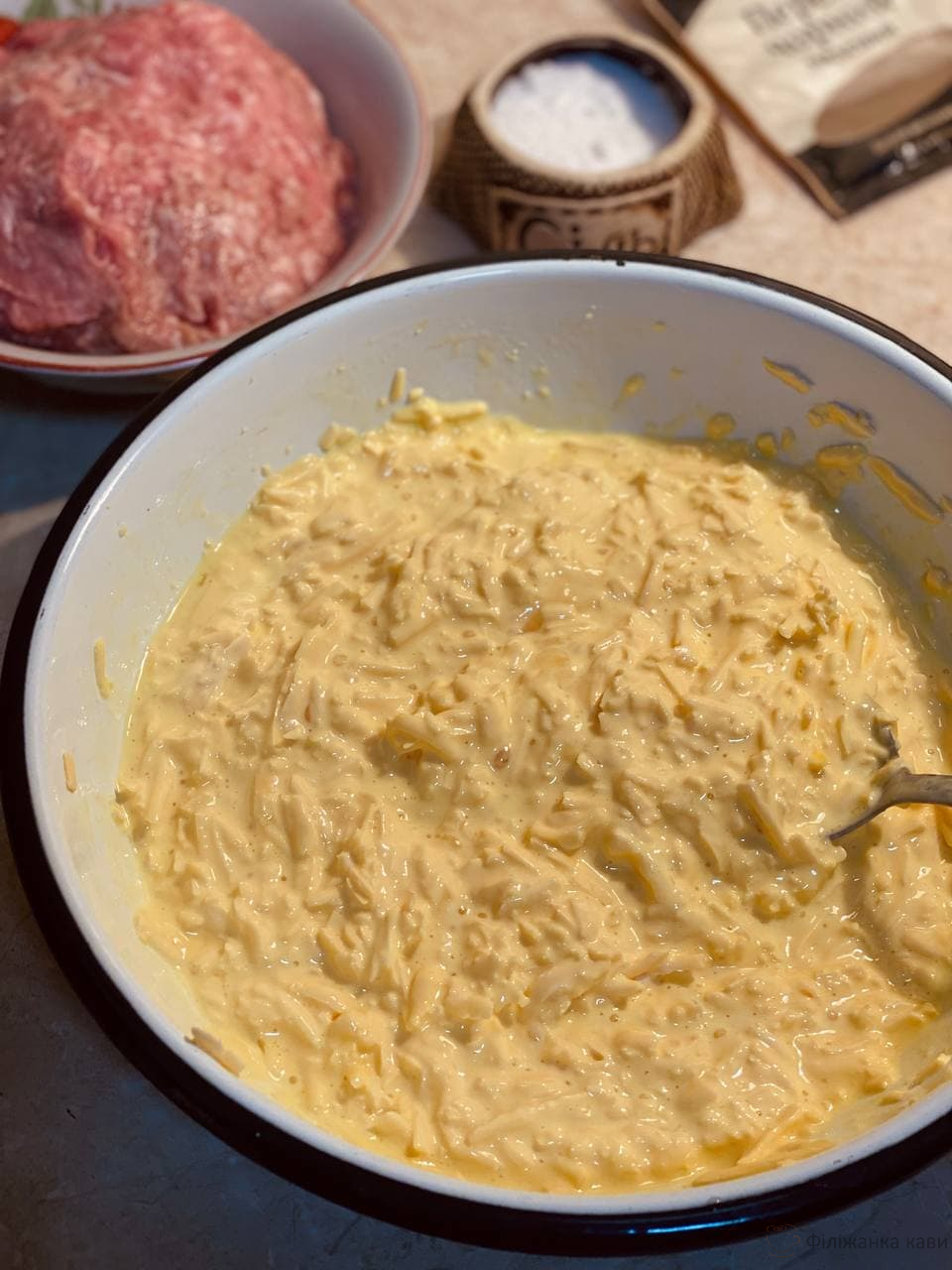 Натираємо сир на велику тертку, додаємо майонез, яйця, перемішуємо.