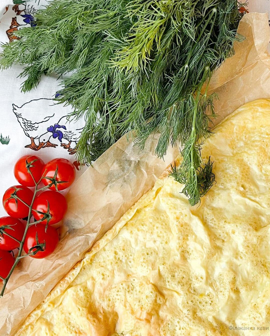 - Застеліть лист пергаментним папером, вилийте яєчну суміш і запікайте в розігрітій духовці протягом 10 хвилин при температурі 200 градусів.