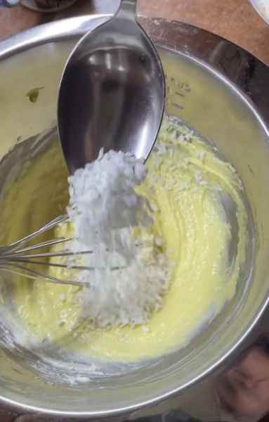 Всипати кокосову стружку, влити кефір – перемішати.