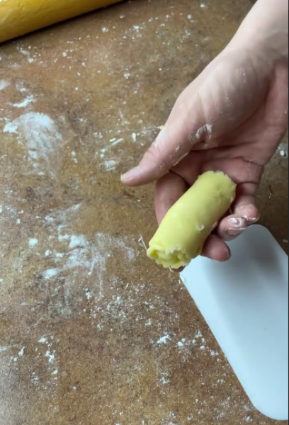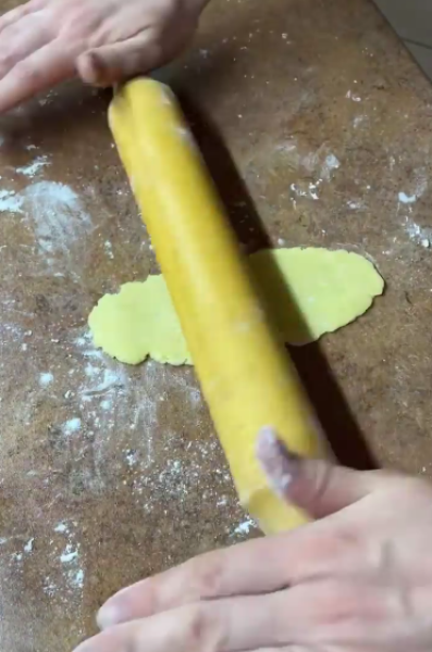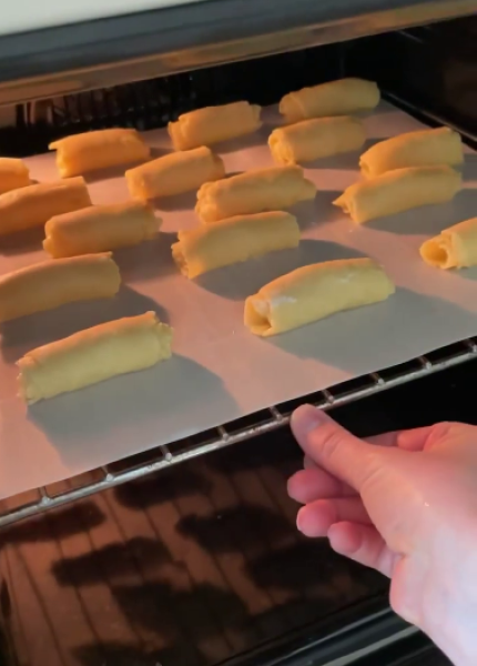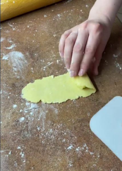 Розмістити в пакет і прибрати в холодильник на 15-20 хв. Охолоджене тісто розділити на 16 шматочків (~ 25 г). Кожну частину розкачати в довгий тонкий овал.