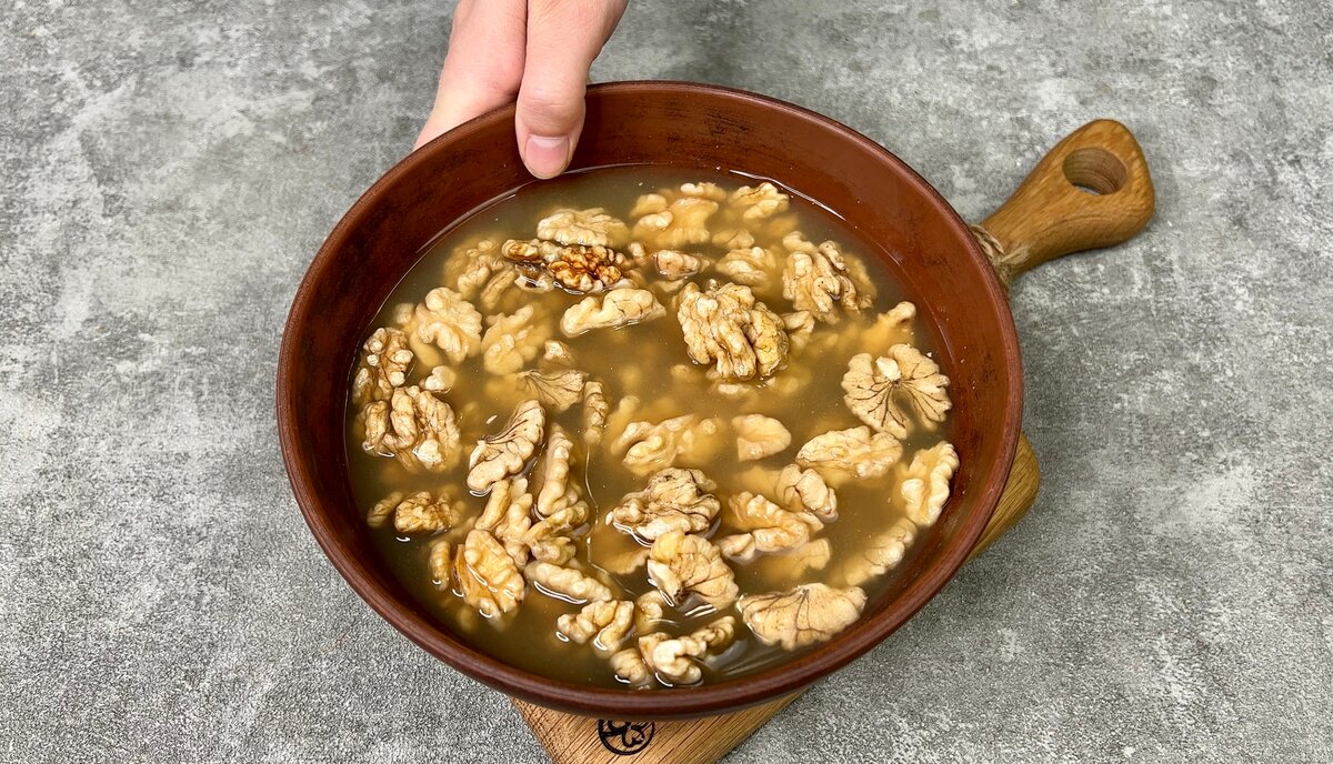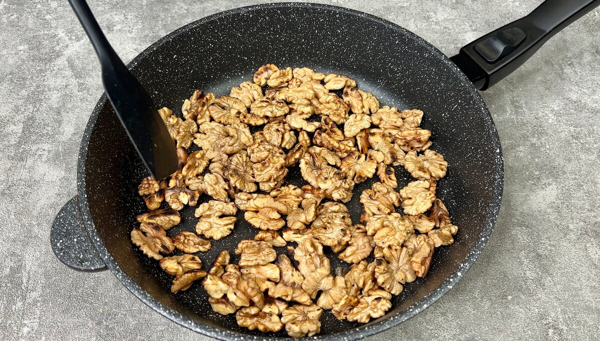 1. Волоські горішки заливаємо окропом, залишаємо на 20 хвилин, потім відкидаємо на друшляк, обсушуємо за допомогою паперових рушників і обсмажуємо на сухій сковороді до легкої золотистості.