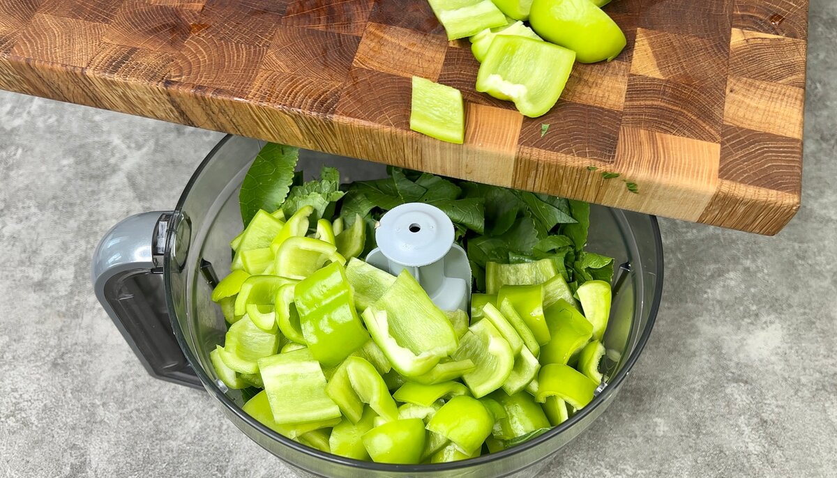 3. Зелений солодкий перець очищаємо від нутрощів і перекладаємо в блендер до листя хрону.