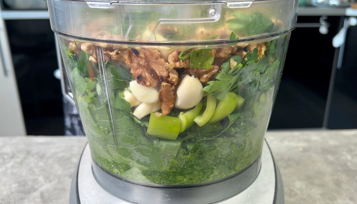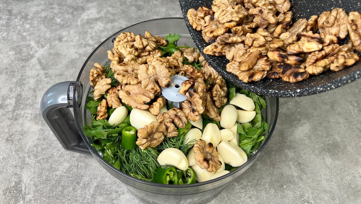 4. Також закладаємо в чашу зелений гострий перець, пучок кропу з петрушкою, часник і обсмажені волоські горішки.