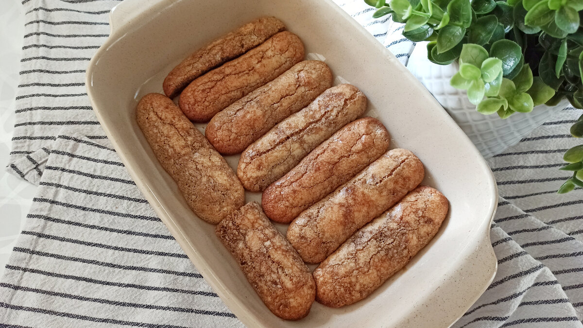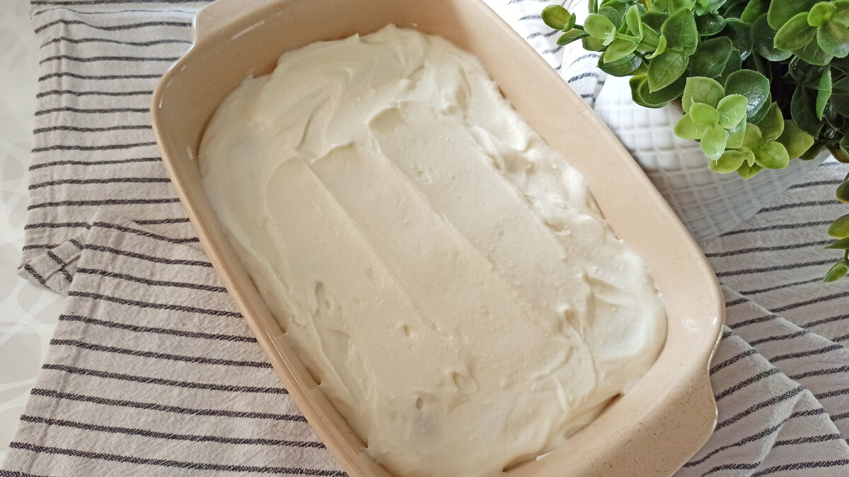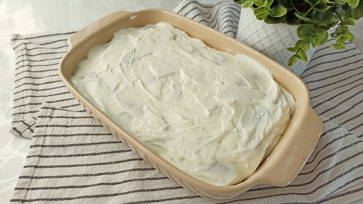 3. Печиво «савоярді» буквально на одну секунду опускаємо в остиглу каву. Викладаємо просочене печиво в прямокутну форму, розміром 25 * 15 см. Поверх печива рівномірно розділимо половину сирного крему.