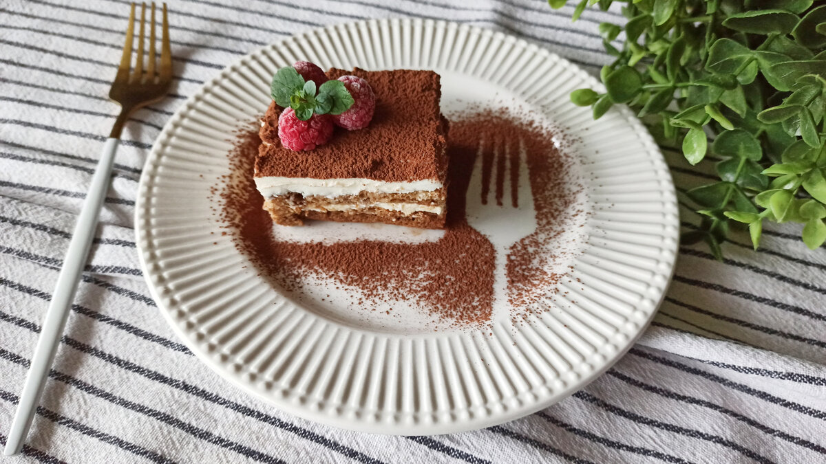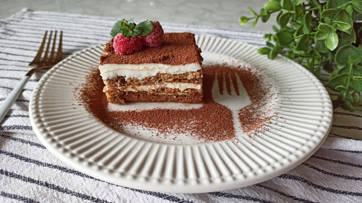 5. Десерт накриваємо харчовою плівкою і відправляємо в холодильник на 2 — 3 години ( можна на ніч ). Після просочування, тірамісу ділимо на шматочки. Уже в порційній тарілці щедро посипаємо ласощі какао і подаємо до столу. За бажанням, прикрашаємо десерт ягодами і свіжою м’ятою. Приємного чаювання!