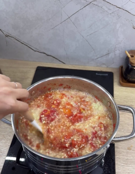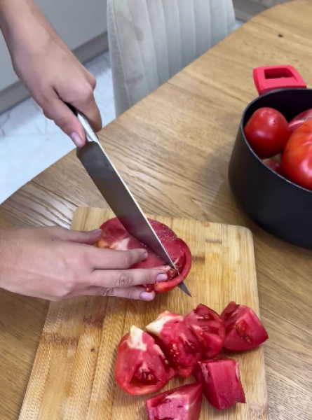 Помідори нарізати, додати до них 50 мл води