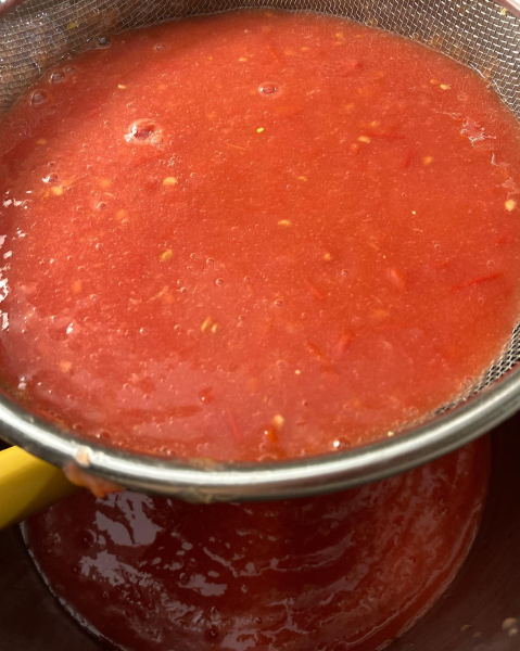 1. Помідори нарізати на маленькі шматочки. Подрібнити блендером. Протерти через сито.