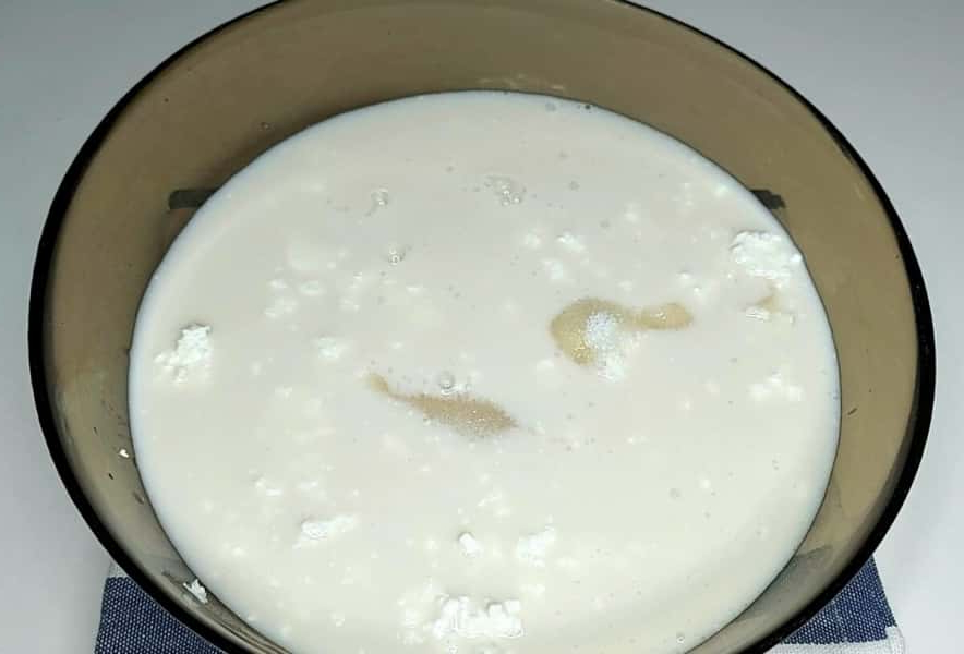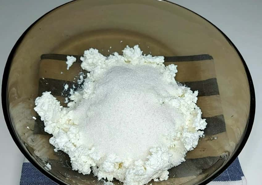 2. У миску з сиром додати цукор та молоко. Добре перемішати за допомогою блендера.