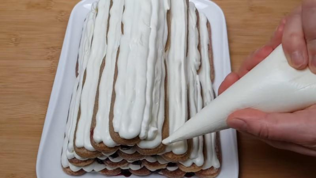 Підготувати тарілку: середину трохи змастити кремом (поверхню, на якій будемо збирати торт). Пропускаємо бісквіти через вишневий сироп, занурюючи їх на 2 секунди. Злийте зайвий сироп і викладіть печиво на кремовий шар на підносі. Викладаємо печиво таким чином, щоб вийшла «хатка» з 2 рядів по 5 штук, з вільними проміжками близько 2 мм. Заповнюємо порожні місця кремом.