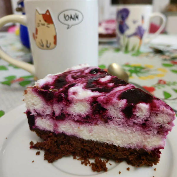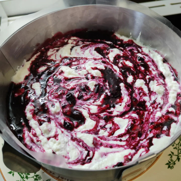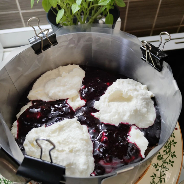 Поперемінно викладаємо у форму поверх основи сирний та ягідний шари. Розмазувати не потрібно – просто купками 😄