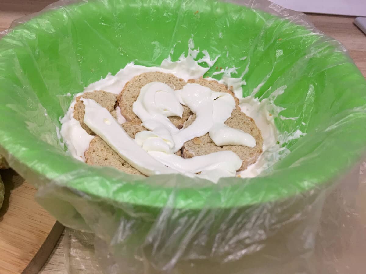 Дно покриваємо сметаною, потім викладаємо пряники впритул, не залишаючи порожніх місць. Рясно змащуємо сметаною.
