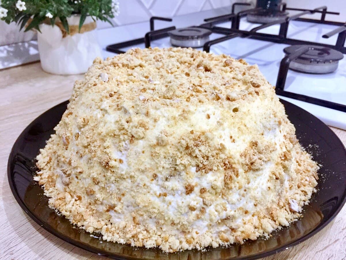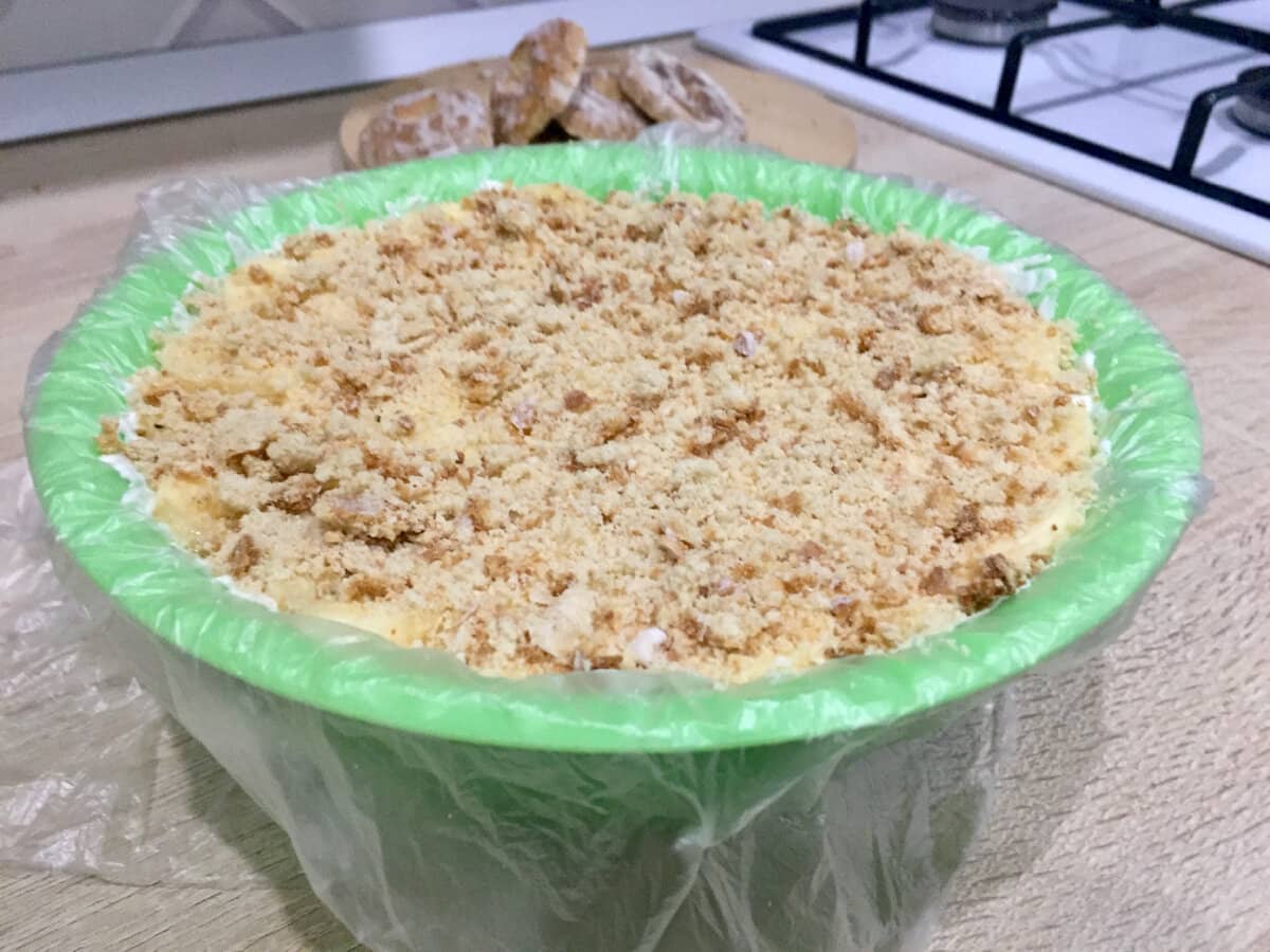 Потім перевертаємо на тарілку, прибираємо плівку. Весь торт обмазуємо сметаною і посипаємо пряниковими крихтами.