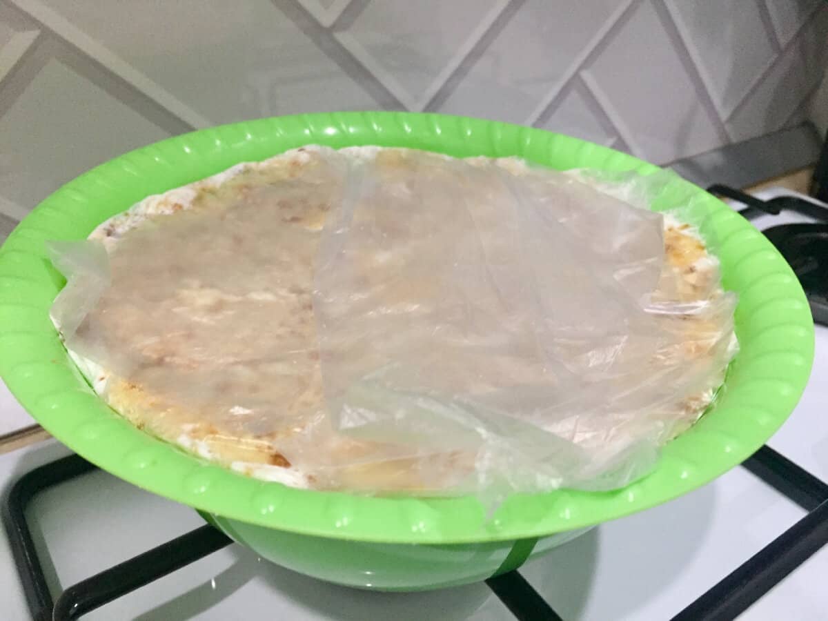 Піднімаємо кінці плівки наверх, закриваємо торт, трохи притискаємо по колу. Ми залишаємо на півгодини просочитися при кімнатній температурі, а потім ставимо в холодильник і тримаємо кілька годин ( краще на ніч ).