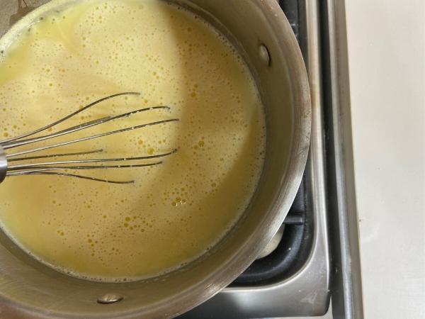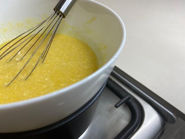 Постійно помішуючи вінчиком, доводимо яєчну суміш на водяній бані до кипіння, але не даємо їй закипіти.