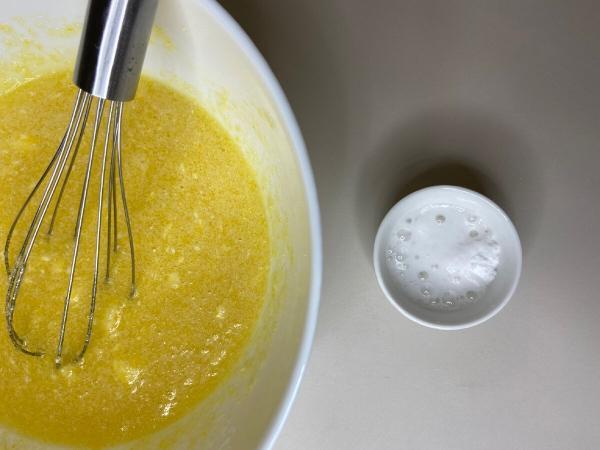 У яєчну суміш додаємо соду гашену оцтом. Знову перемішуємо.