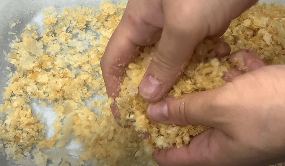 Верхні пласти, які злегка підрум’янилися, кришимо руками. Це буде служити прикрасою торта.