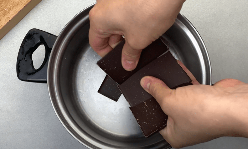 Плитку шоколаду (80 г) розламуємо на шматочки і викладаємо в каструлю.