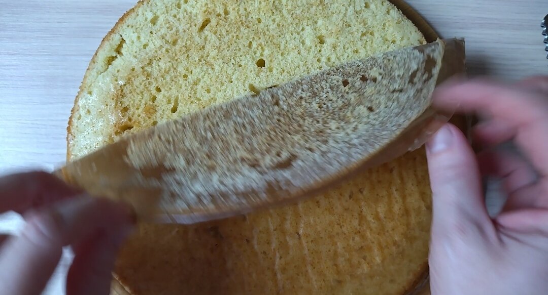 Випечений корж очищаю від паперу.