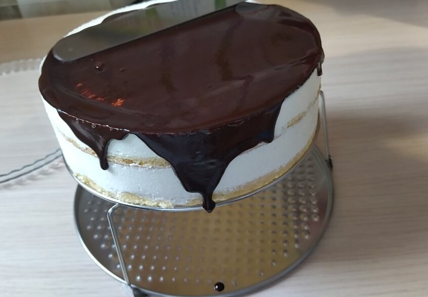 Покриваю, заздалегідь приготовленою глазур’ю (шоколад і масло розтопити на водяній бані). Відправляю в холодильник на пів години, щоб глазур застигла.