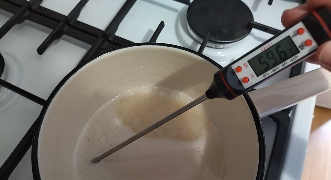 Ставлю на вогонь, постійно розмішуючи, нагріваю до темп. – 60 градусів.