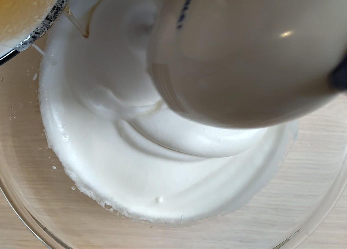 Білки збиваю на високій швидкості, до середніх піків. Не припиняючи збивати додаю лимонну кислоту і поступово засипаю 5 ст. л. цукру і ванільний цукор.