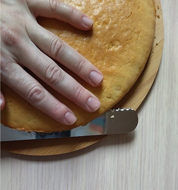 Ножем розрізаю корж навпіл.