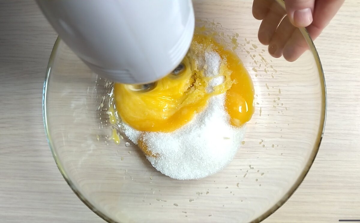 У жовтки додаю цукор, ванільний цукор і збиваю міксером на високій швидкості добіла.