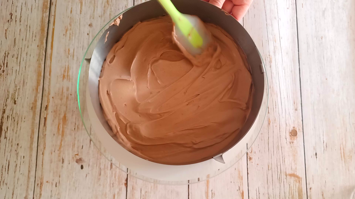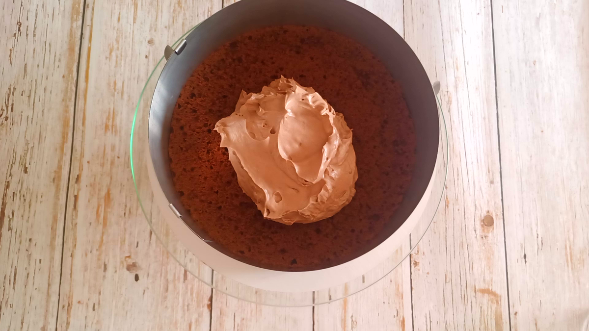 Перший бісквітний корж, впритул фіксую роз’ємним кільцем. Викладаю крем.