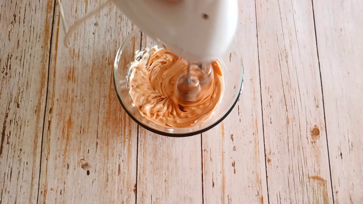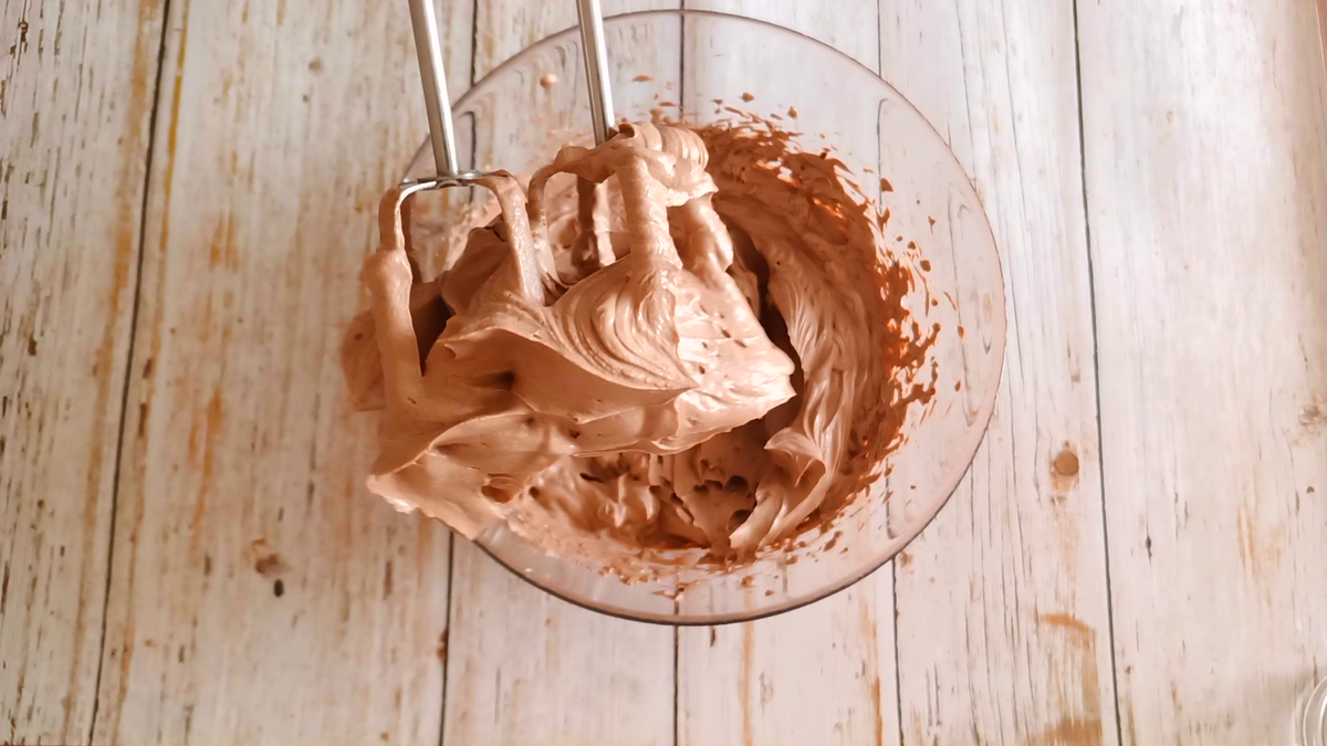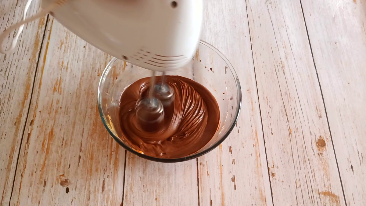 В сметану, що залишилася додаю шоколадно-сметанну суміш. Вимішую міксером до отримання стабільного шоколадно-сметанного крему. Крем стійко тримається на лопатях міксера і готовий до роботи.