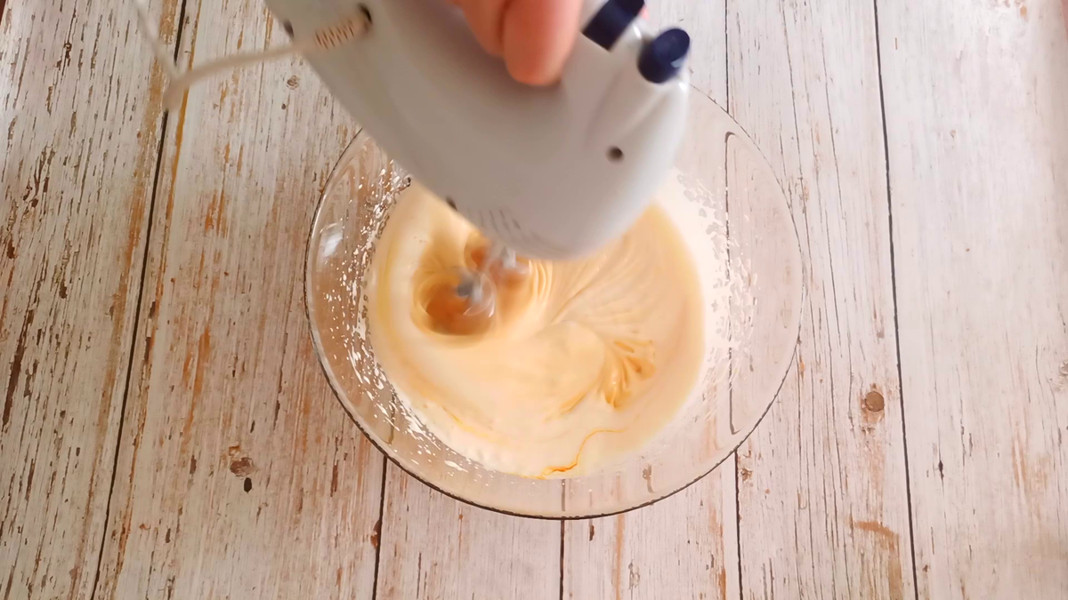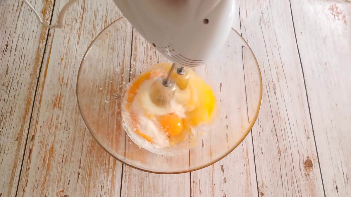 У яйця всипаю цукор і вимішую на високих оборотах міксера до пишної яєчної суміші.