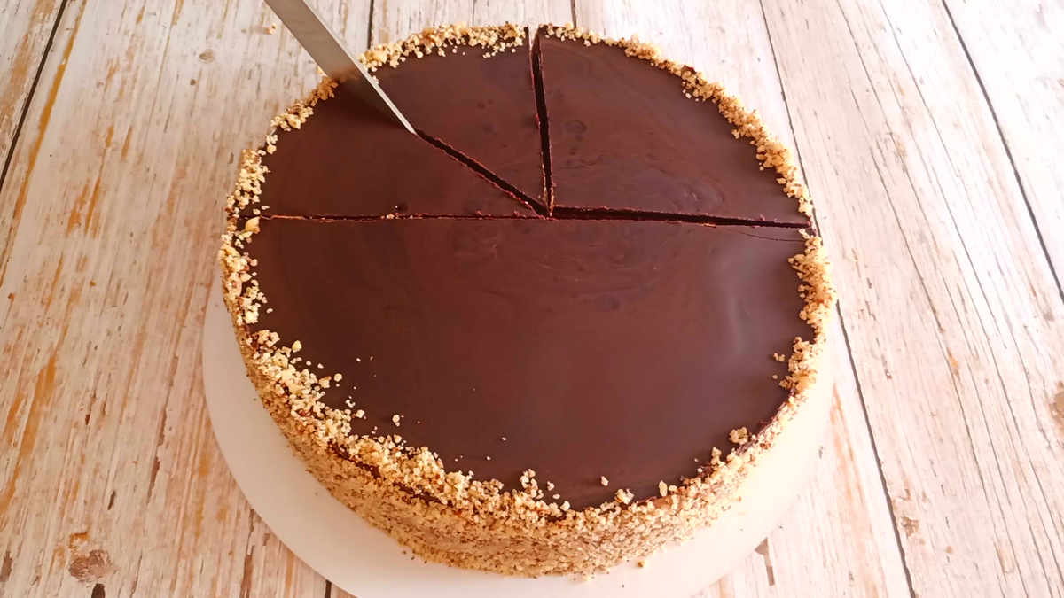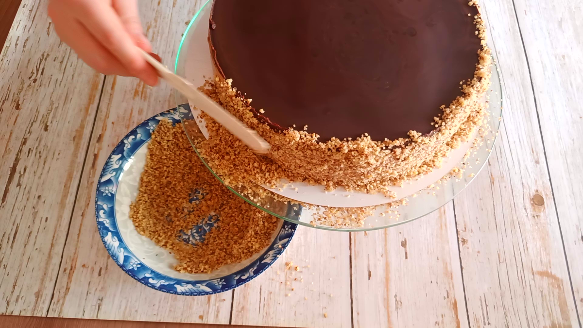 Обсипаю торт меленими волоськими горіхами, які я попередньо роздрібнив в блендері. При цьому горіхи потрібно фіксувати, щоб вони потім не обсипалися.