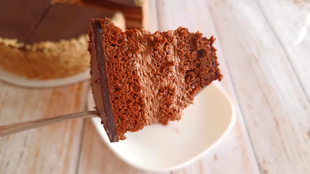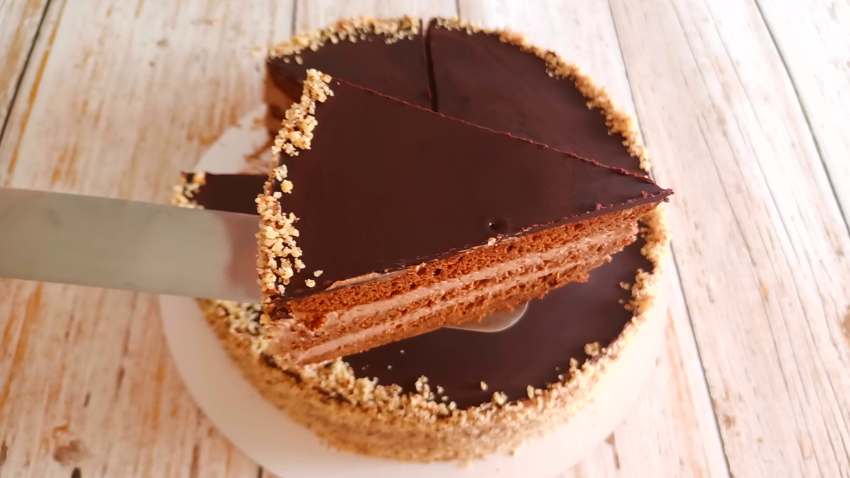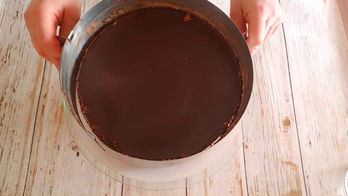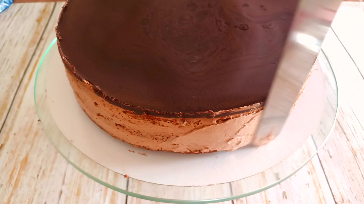 Обережно відокремлюю глазур від форми гострим ножем. Остаточно відокремлюю торт від кільця довгим ножем. Витягаю кільце.