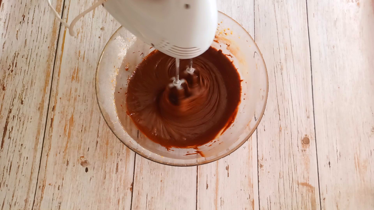 Всипаю какао порошок і продовжую вимішувати. Але не вмішані залишки знімаю зі стін чаші силіконової лопаткою. Остаточно перемішую міксером до однорідності.