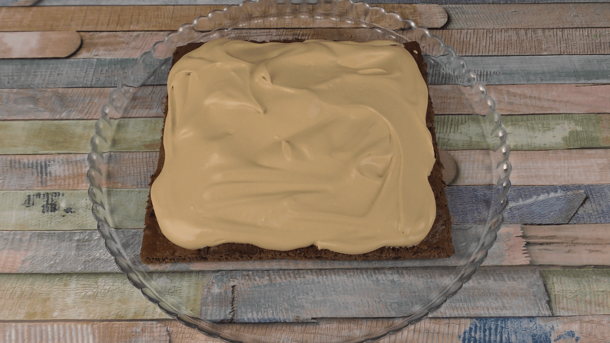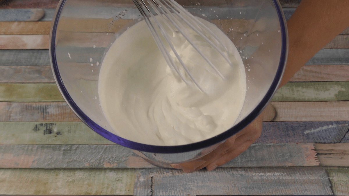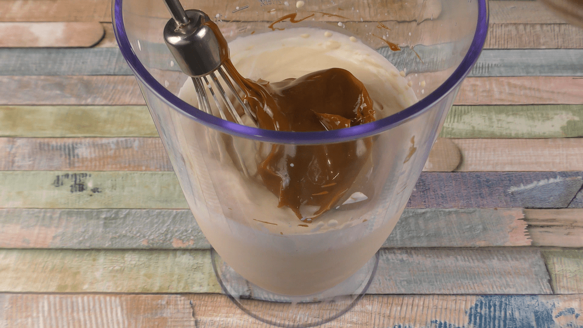 Для крему 300 мл добре охолоджених вершків жирністю 33% збиваємо міксером до густоти і м’яких піків. Починаємо з невеликої швидкості, потім її поступово збільшуємо. Далі додаємо 150-190 г вареного згущеного молока, також холодного. Збиваємо кілька хвилин, щоб вийшов густий крем.