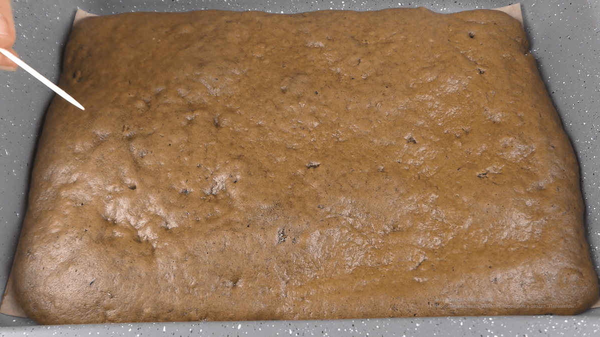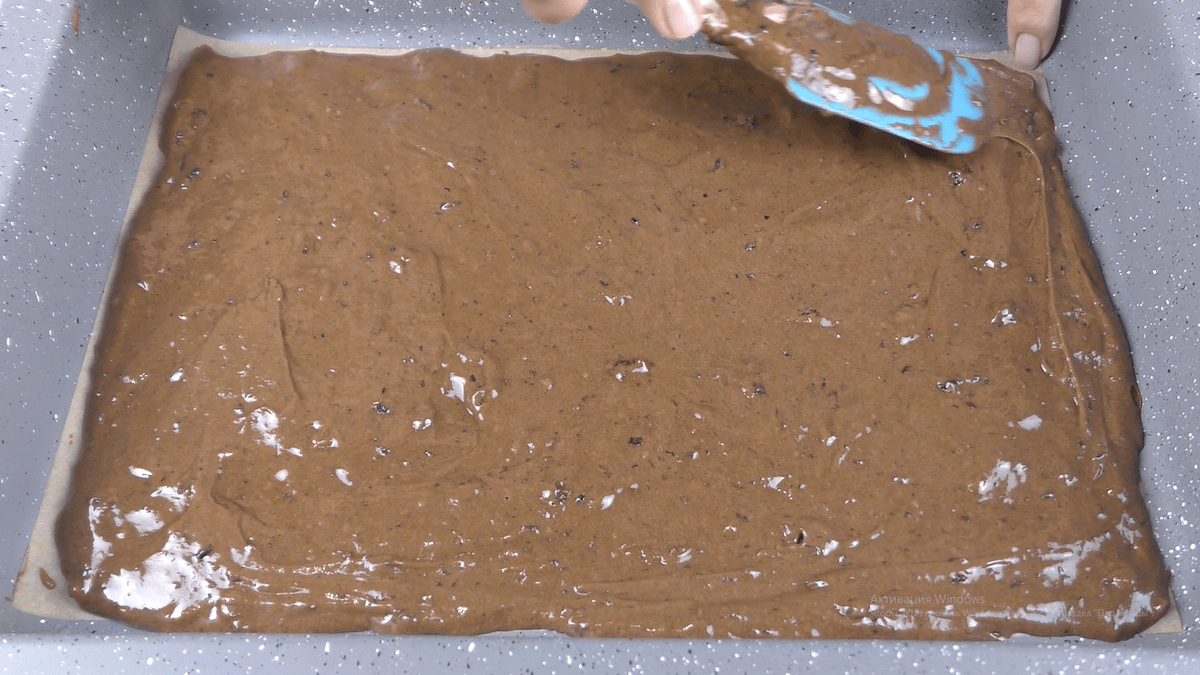 Дно форми 30 * 24 см застеляємо антипригарним пергаментом. Виливаємо половину тіста і розрівнюємо.