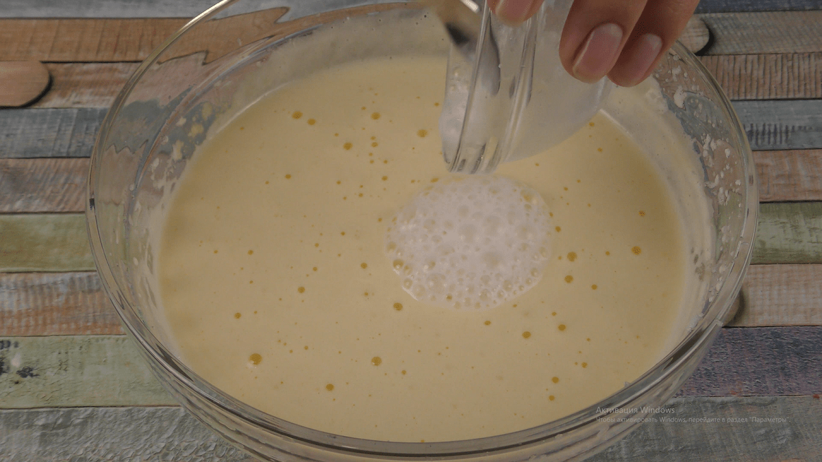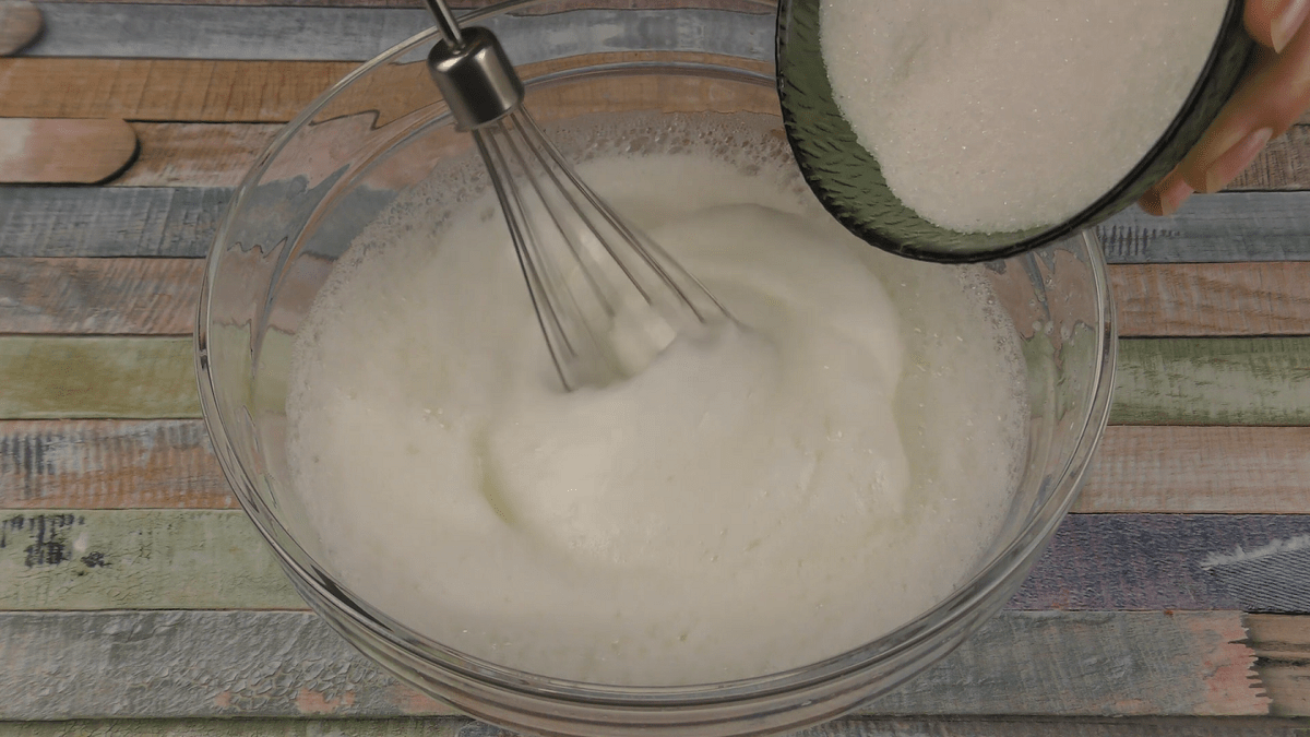 3 яйця ділимо на білки і жовтки. До білків додаємо щіпку солі і збиваємо до пивної піни. Далі частинами додаємо 100 г цукру і продовжуємо збивати до м’яких піків. В даному випадку збивати до стійких піків необов’язково.