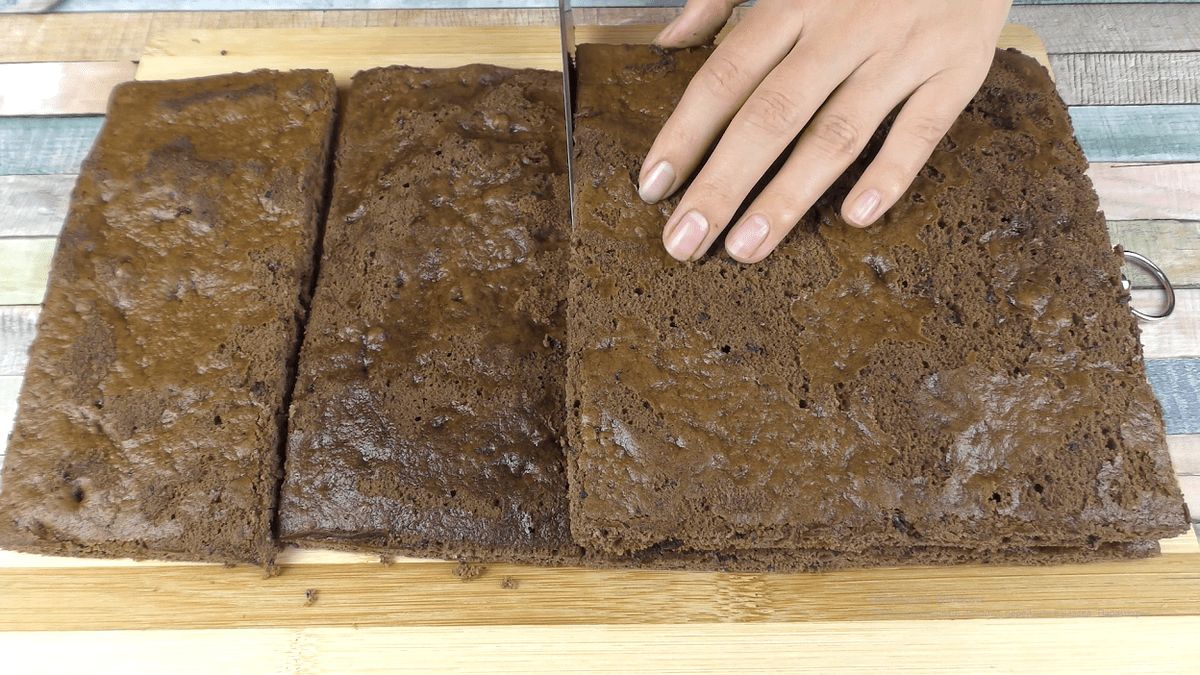 Обрізаємо краї коржів, щоб вони були рівними. Щоб зробити 3-й корж з кожного коржа відрізаємо 1/3 частину. Коржі повністю остуджуємо.