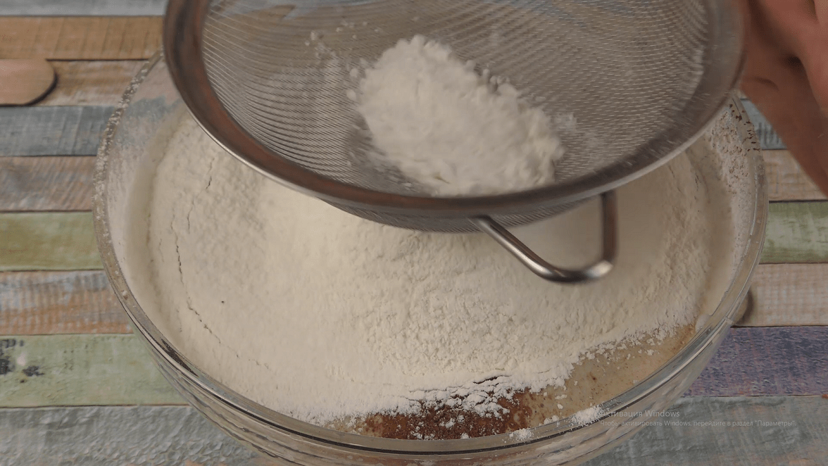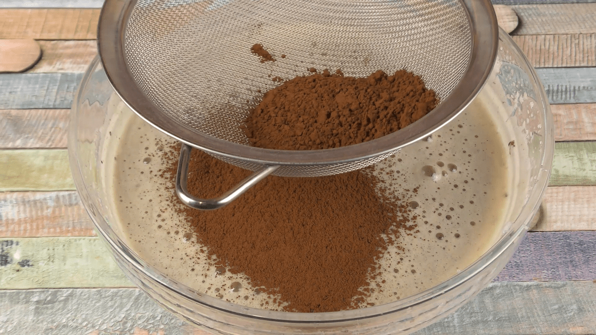 В кінці просіюємо какао 1,5 ст.л. і 200 г борошна. Акуратно перемішуємо лопаткою. Виходить густе тісто з шматочками родзинок.