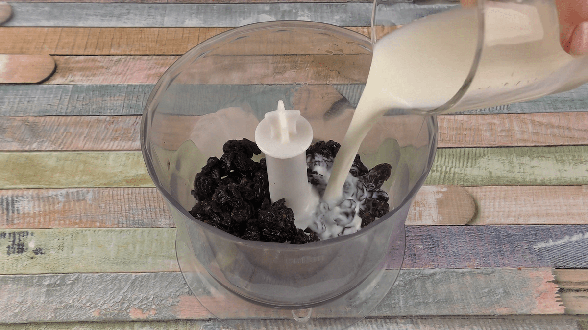 80 г світлих або темних родзинок заливаємо гарячою водою і залишаємо на 10 хвилин, щоб родзинки стали м’якшими. Родзинки перекладаємо в подрібнювач, додаємо половину молока і подрібнюємо.