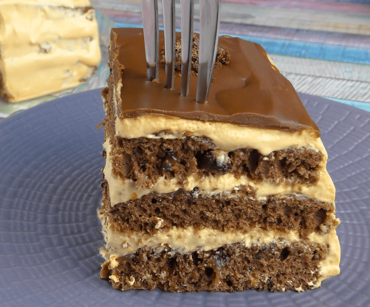 Торт великий і високий. Шматочок добре тримає форму. Коржі середні по вологості і повітряності з насиченим смаком сухофруктів, а саме родзинок. Карамельний крем доповнює смак коржів. В цілому вийшло незвично і смачно. Якщо хочеться чогось новенького тоді сміливо пробуйте цей рецепт.
