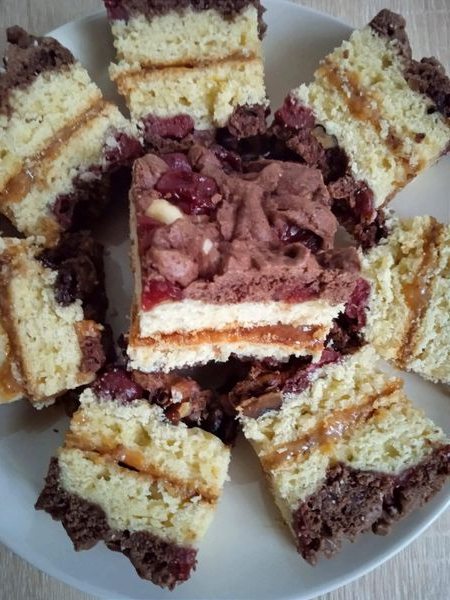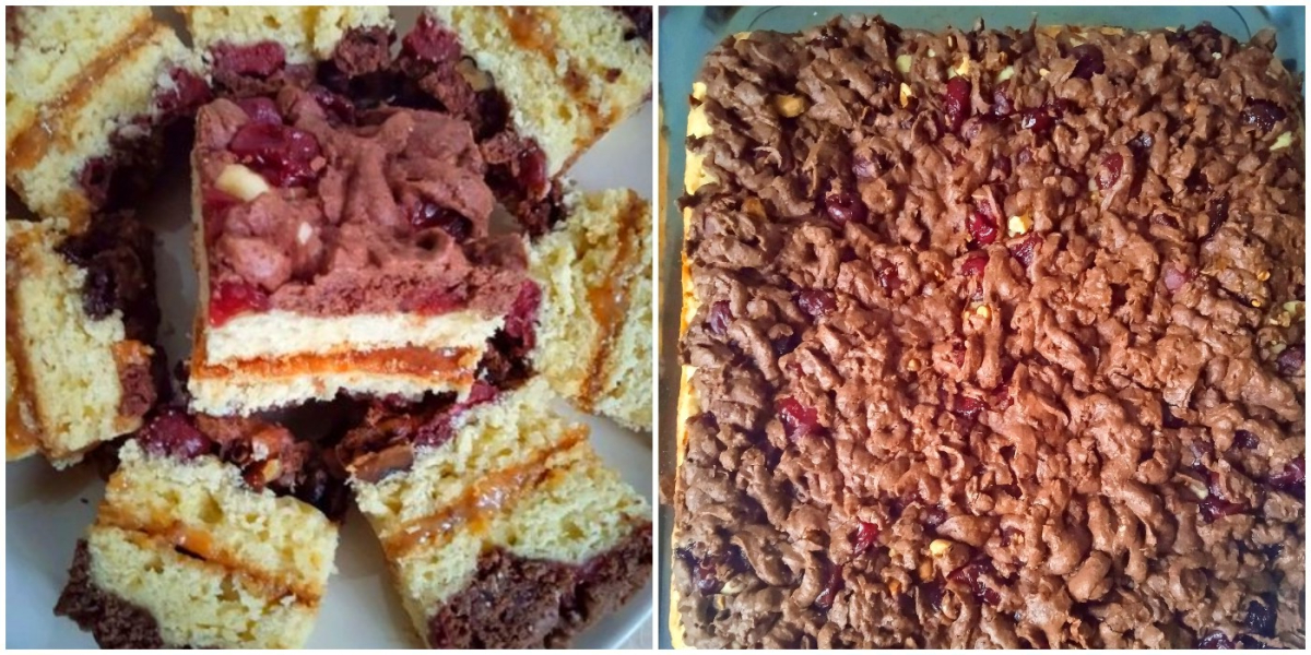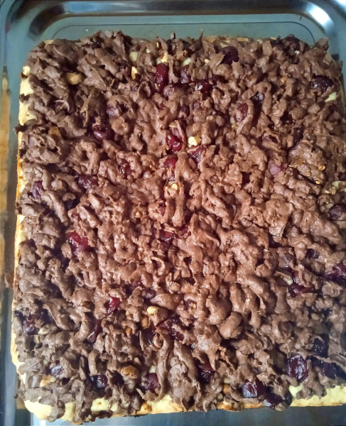 На біле тісто кладем вишні, по вишнях ,горішки ,тоді берем тісто з какао з морозилки і тремо по горішках на тертку.